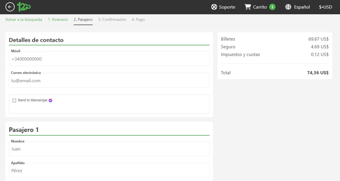 - Agrega los datos personales y contacto de los pasajeros y del comprador.