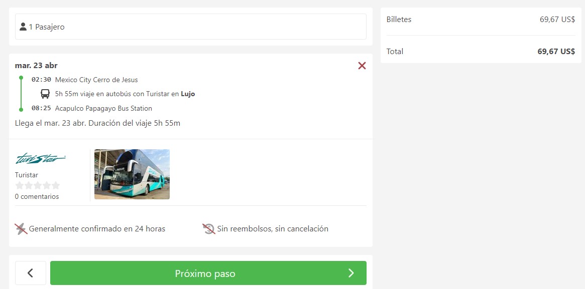 - Selecciona el bus de tu preferencia (ADO, Turistar, ETN, etc), horario y boleto de tu preferencia.